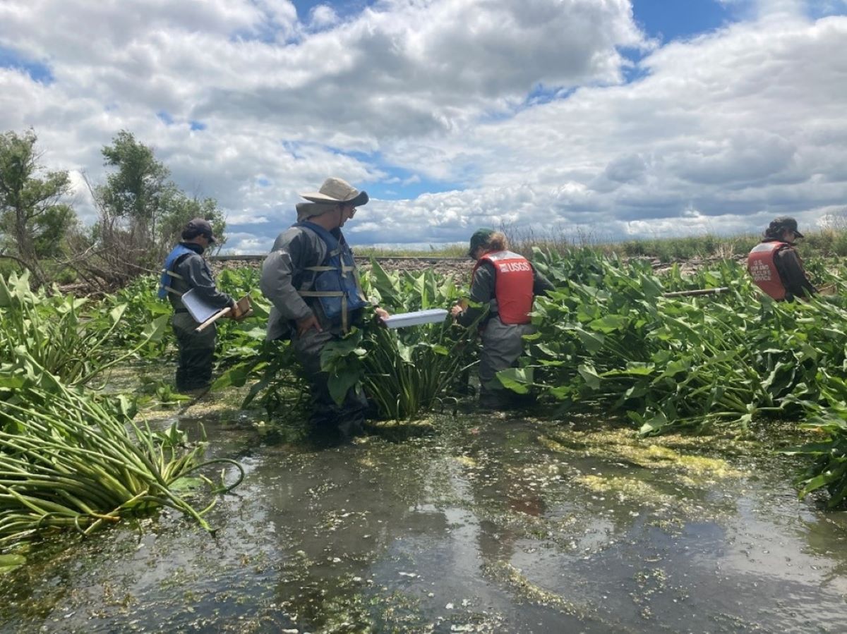 U.S. Fish and Wildlife Service (USFWS), U.S. Geological Survey (USGS), and University of Michigan research and monitoring team conduct wetland macroinvertebrate survey. In the photo from left to right Matthew Conrad (University of Michigan), Joshua Fishbein (University of Michigan), Sasha Bozimowski (USGS), and Eliza Lugten (USFWS).