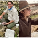 Left: Supervisory Fish Biologist Randy Gibson sampling springs for groundwater invertebrates at Honey Creek State Natural Area. Right: Fish and Wildlife Biologist Amelia Hunter examining a bulk preserved sample after drift netting at a Williamson County spring.