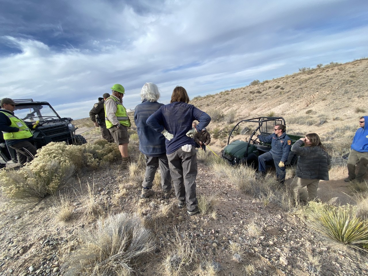 U.S. Fish and Wildlife and U.S. Air Force fire personnel discuss the basics of safely maneuvering an off-road vehicle on steep, uneven terrain.