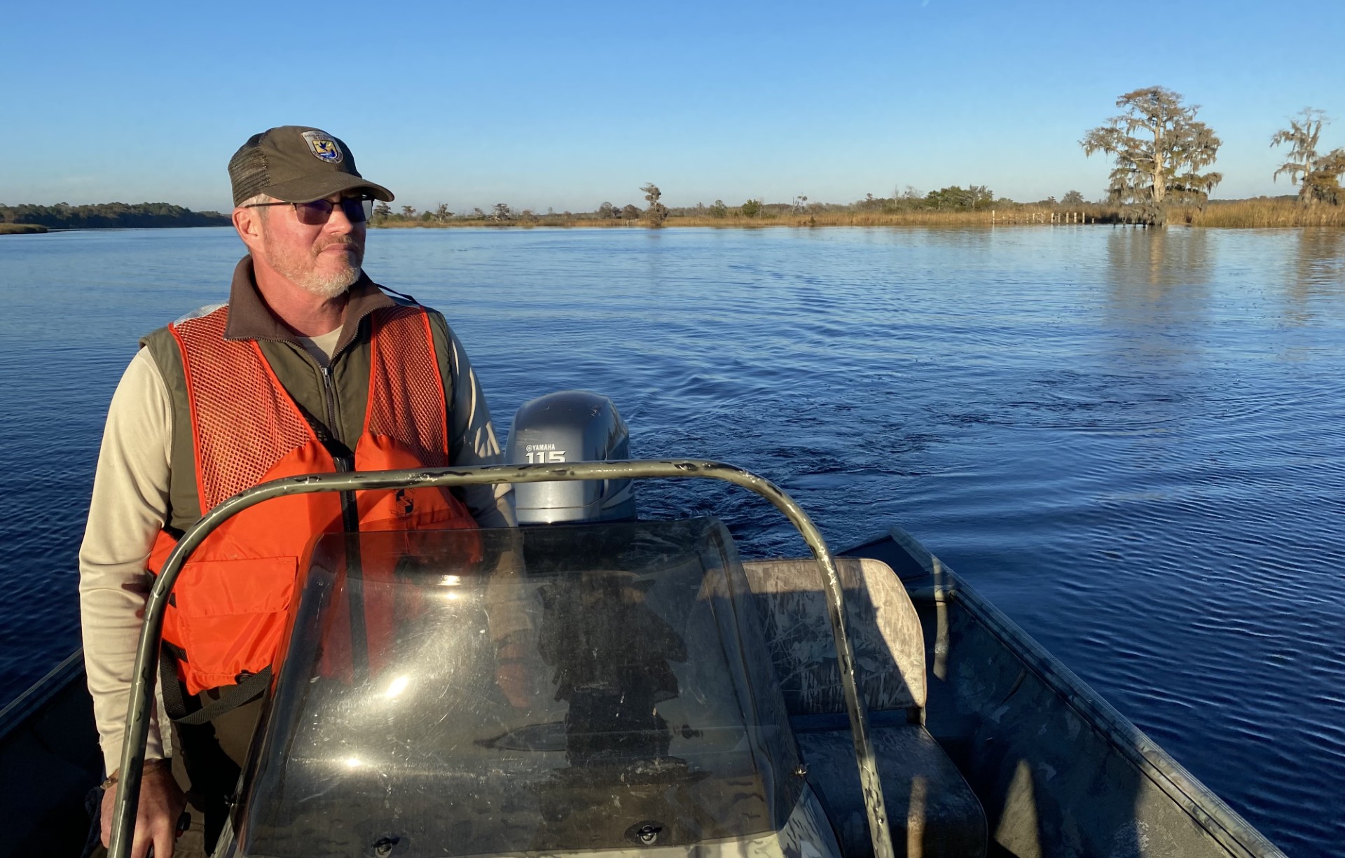 Craig Sasser, refuge manager at Waccamaw refuge, cruises the eponymous river in search of the tell-tale signs of climate change.