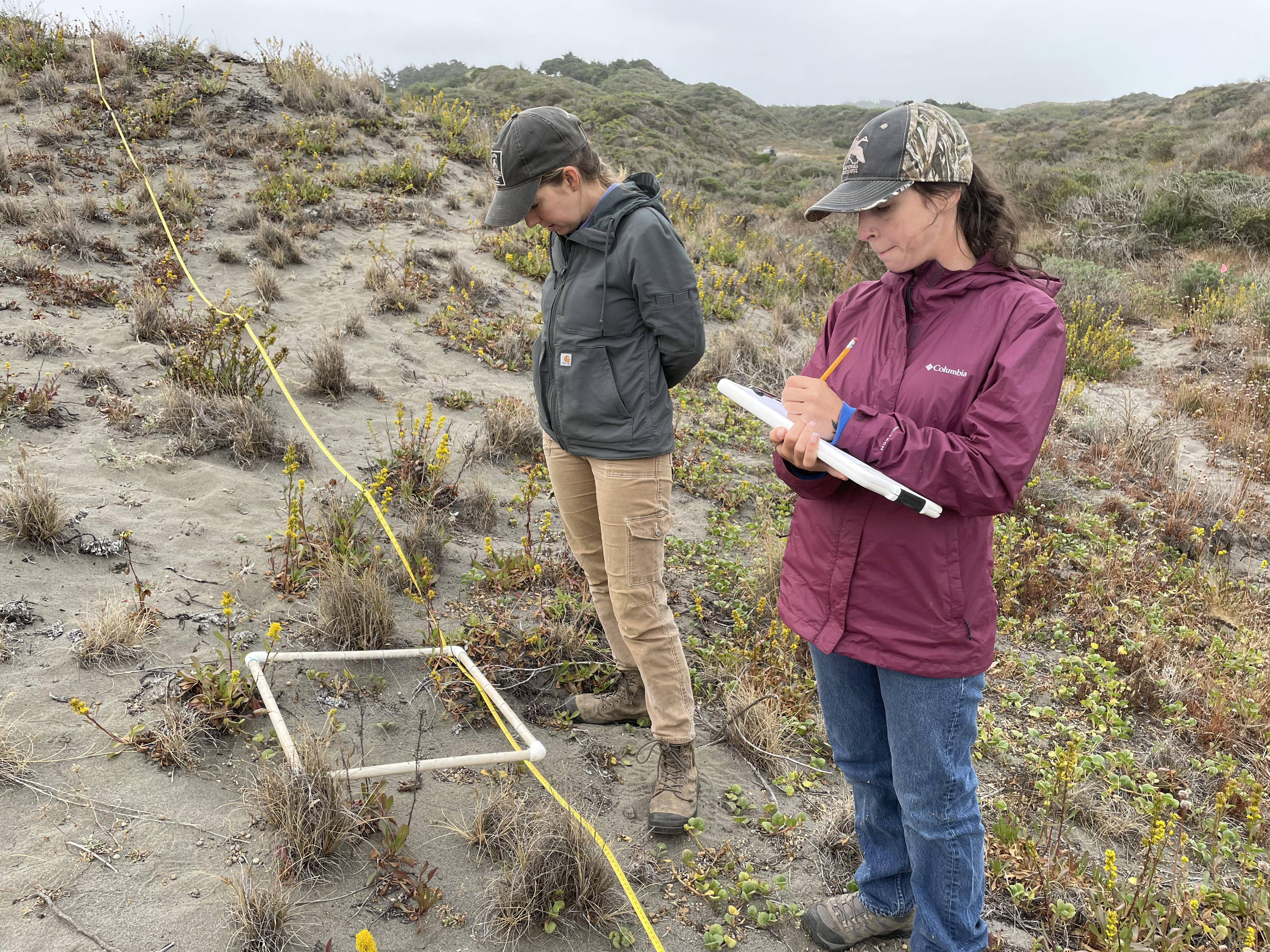 Jillian Zimmerman (left) and Nicole Matonak (right) surveying plants in Wadulh dunes, Humboldt Bay NWR.