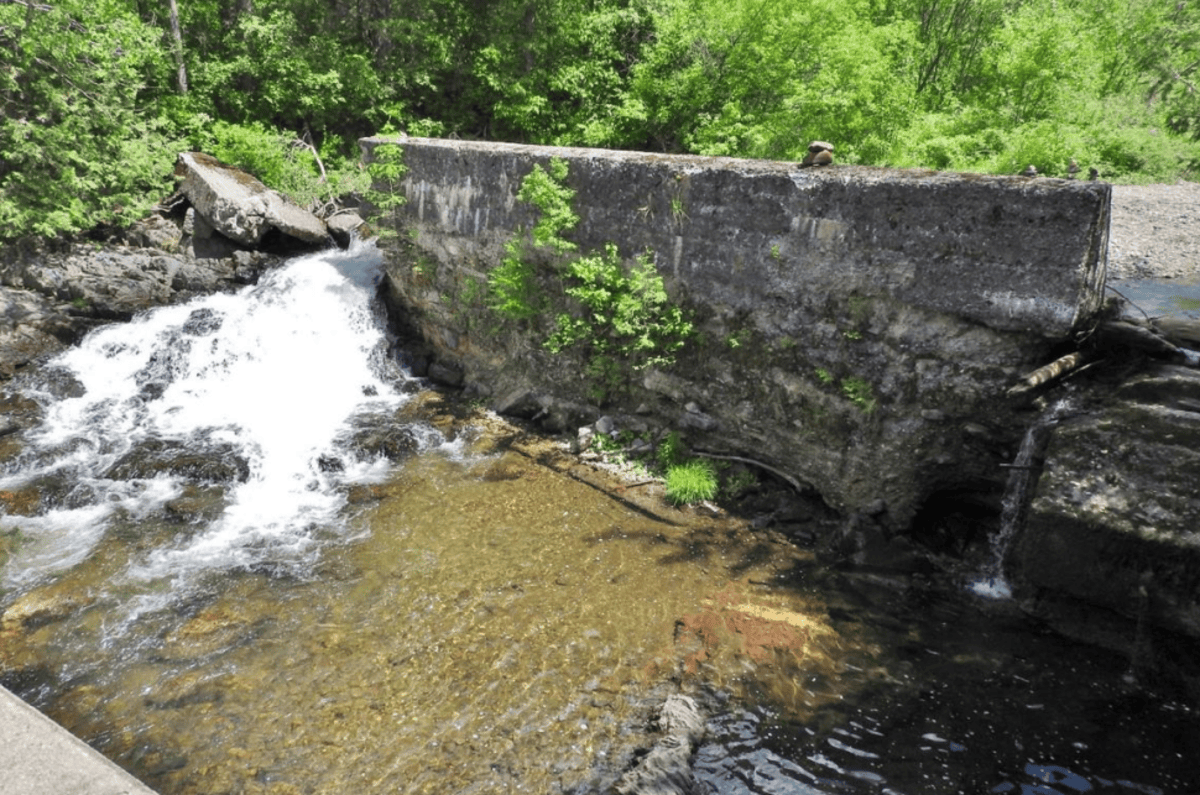 Photo taken facing southeast toward Washburn Mill Dam from the vantage point of Diamond Pond Road Bridge in 2021. The structure has deteriorated further than the 1980 photo, creating debris.