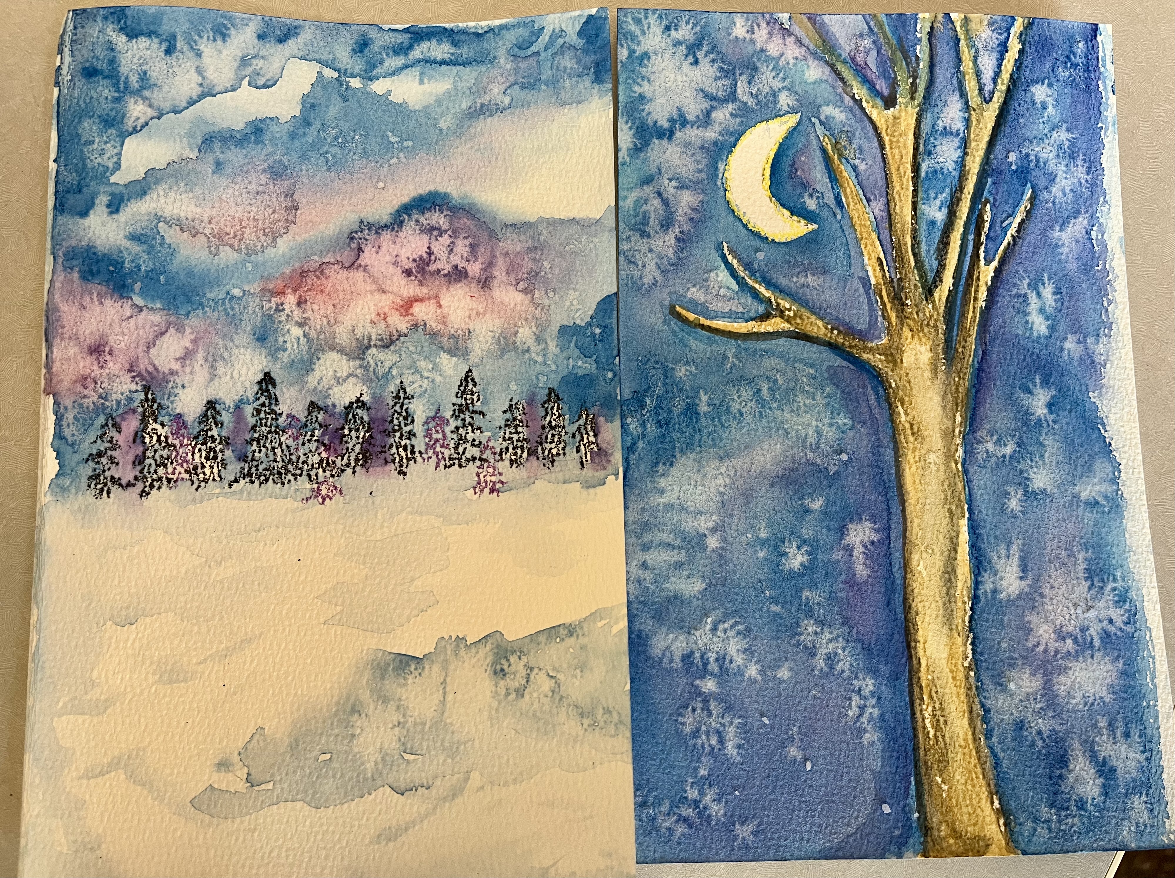 Who knew such a common condiment could be fun to paint with? Sprinkling table salt across wet watercolor paint creates fractal designs that look a little like stars or snowflakes. The two pieces of artwork in this photo were inspired by designs made by Amanda The Green Artist and Dionne of the blog, "Passengers on a Little Spaceship." Exploring our natural landscapes through art helps us pay attention to the seasons of change!