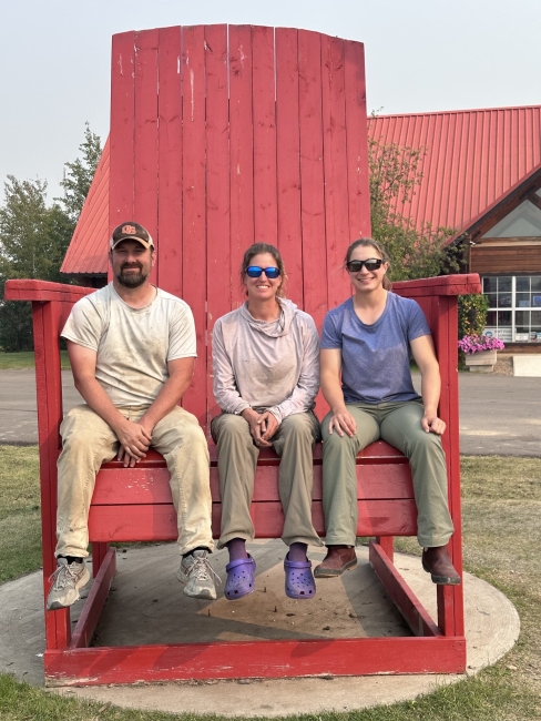 The Hay-Zama Waterfowl Banding Operations crew (left to right): Joe Sands, Amy O’Donnell, and Jennie Froehly kick back in an easy chair after completing banding operations for 2023.