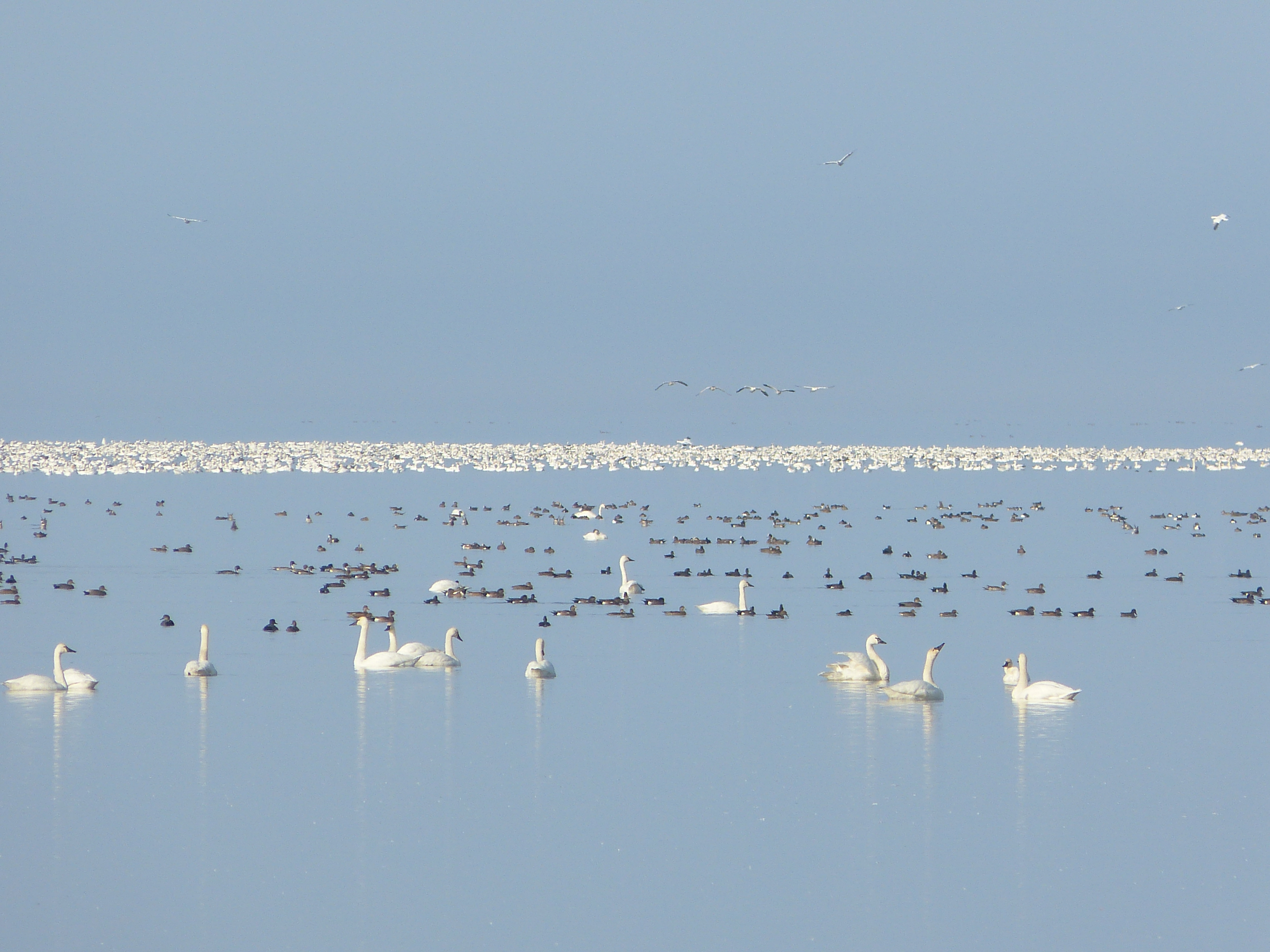 Tundra swans, snow geese, American wigeon, northern pintail, gadwall, and American black duck rest and swim on Lake Mattamuskeet, part of Mattamuskeet National Wildlife Refuge