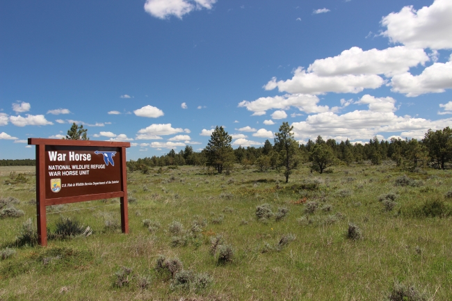 The War Horse National Wildlife Refuge sign at War Horse Unit greets visitors to the mixed-grass and sagebrush prairie savanna and Ponderosa pine woodland. Photo by Cortez Rohr/USFWS.