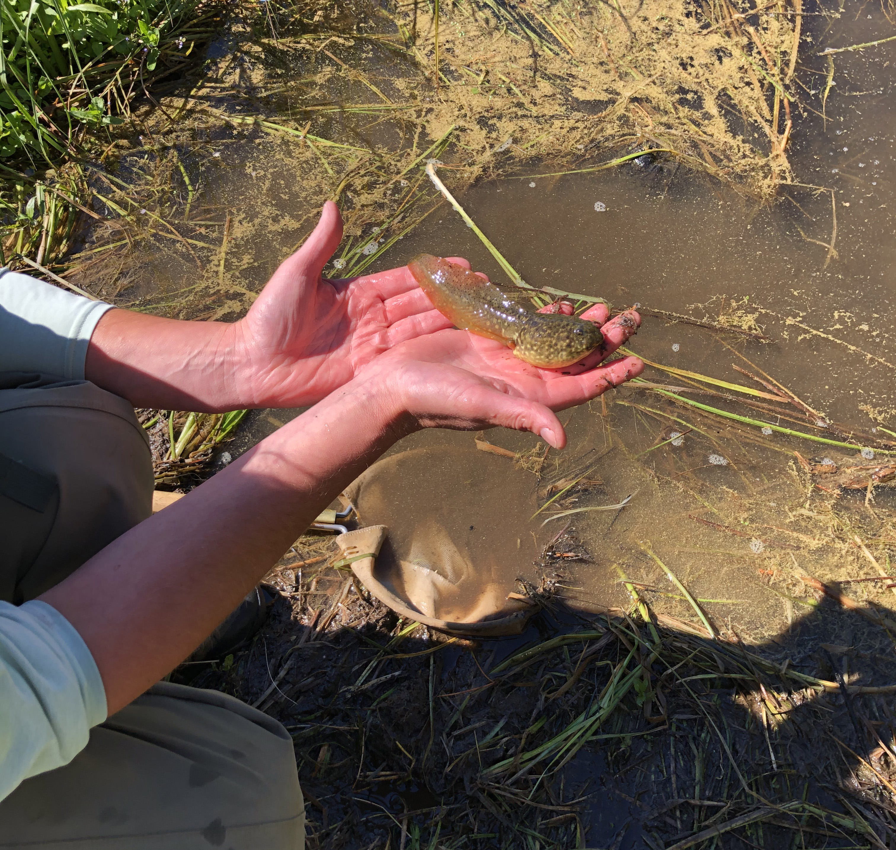 A Washoe Environmental Protection Department member holds a bullfrog tadpole as part of the bullfrog surveys conducted with the Lake Tahoe Basin Management Unit at Sawmill Pond, Lake Baron, and Frog Pond. Photo courtesy of Washoe Environmental Protection Department
