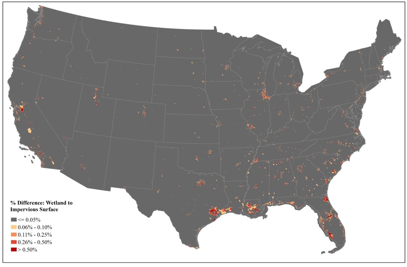Wetland to Impervious Surface Difference Product for census tracts in the Contiguous US. Census tracts with ≤0.05% of wetland to impervious surface difference, calculated by area, are displayed in gray, while those that have greater than half a percent difference are displayed in dark red. Patterns are largely controlled by the age of National Wetlands Inventory (NWI) data and development trends. Thus areas that exhibit greater difference (i.e., change) may have older NWI data, more development, or both. These areas are commonly found near cities. Note that although there are concentrated areas of difference, likely change due to impervious increase, the vast majority of the United States has not experienced this level of change since NWI data production and therefore has NWI data that better represent current land cover. Geographies with the greatest levels of difference could be prioritized for NWI updates