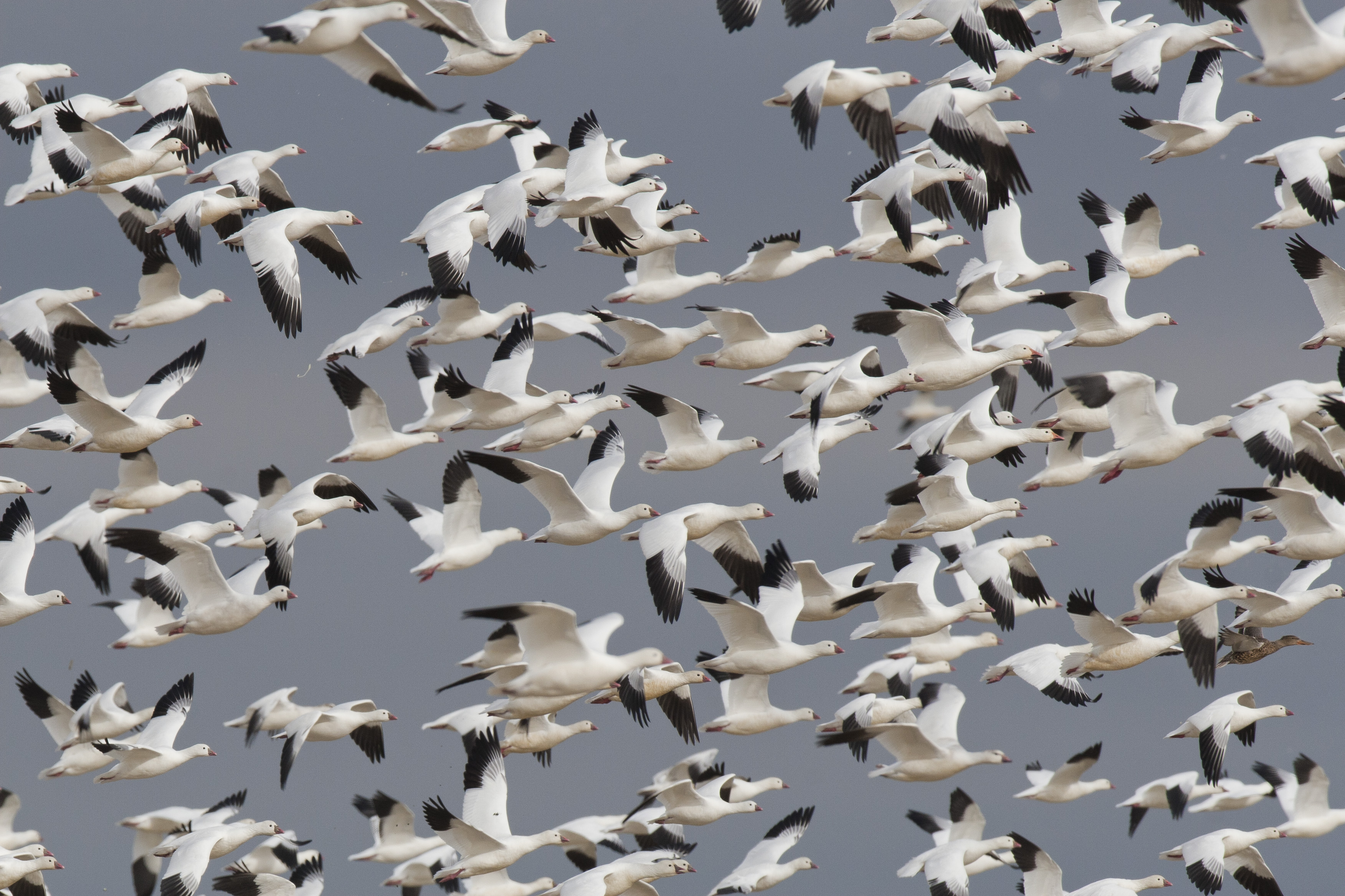 White geese in flight at Sacramento National Wildlife Refuge Complex