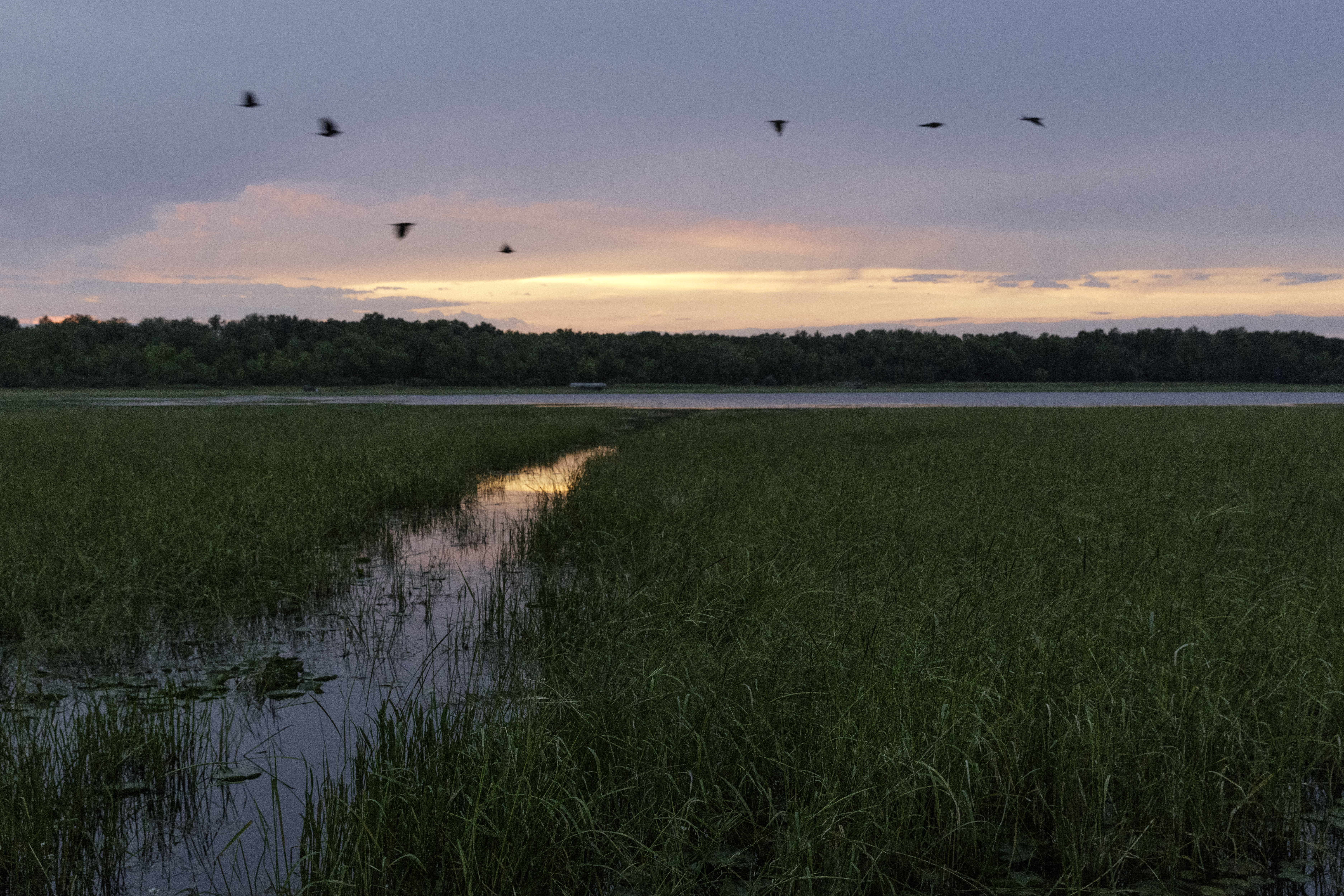 Wild rice in a wetland with waterfowl at sunset in McGregor, Minnesota.