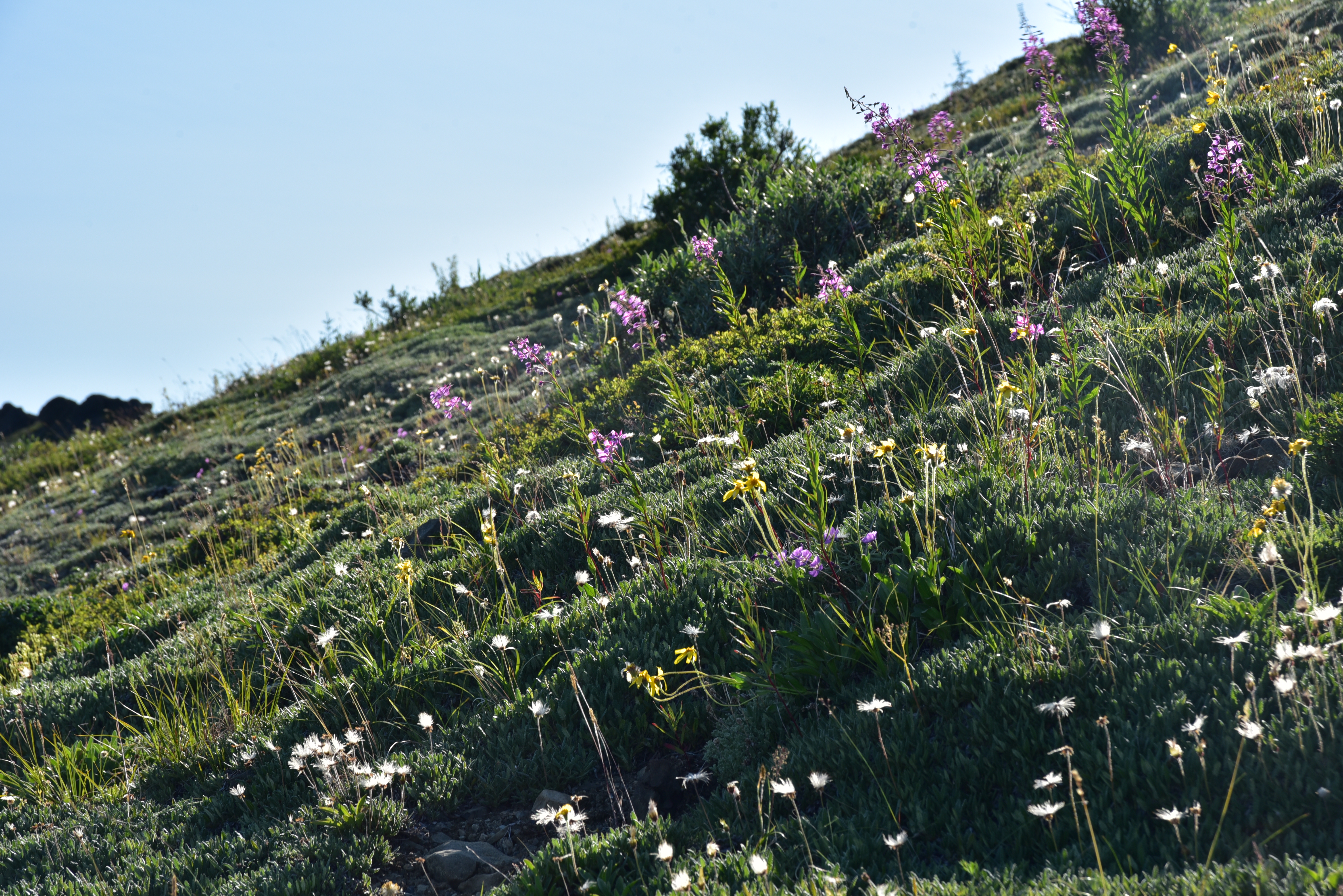 A subalpine slope with wildflowers in the Waring Mountains of Selawik National Wildlife Refuge.