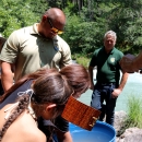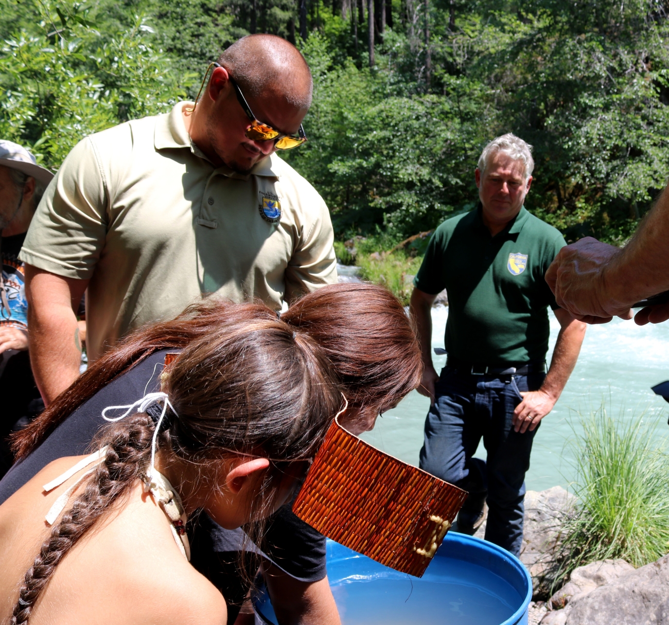 Two Winnemem Wintu children place cups full of winter-run Chinook salmon eggs into a remote-site incubator where the eggs will mature before being released into the McCloud River.