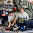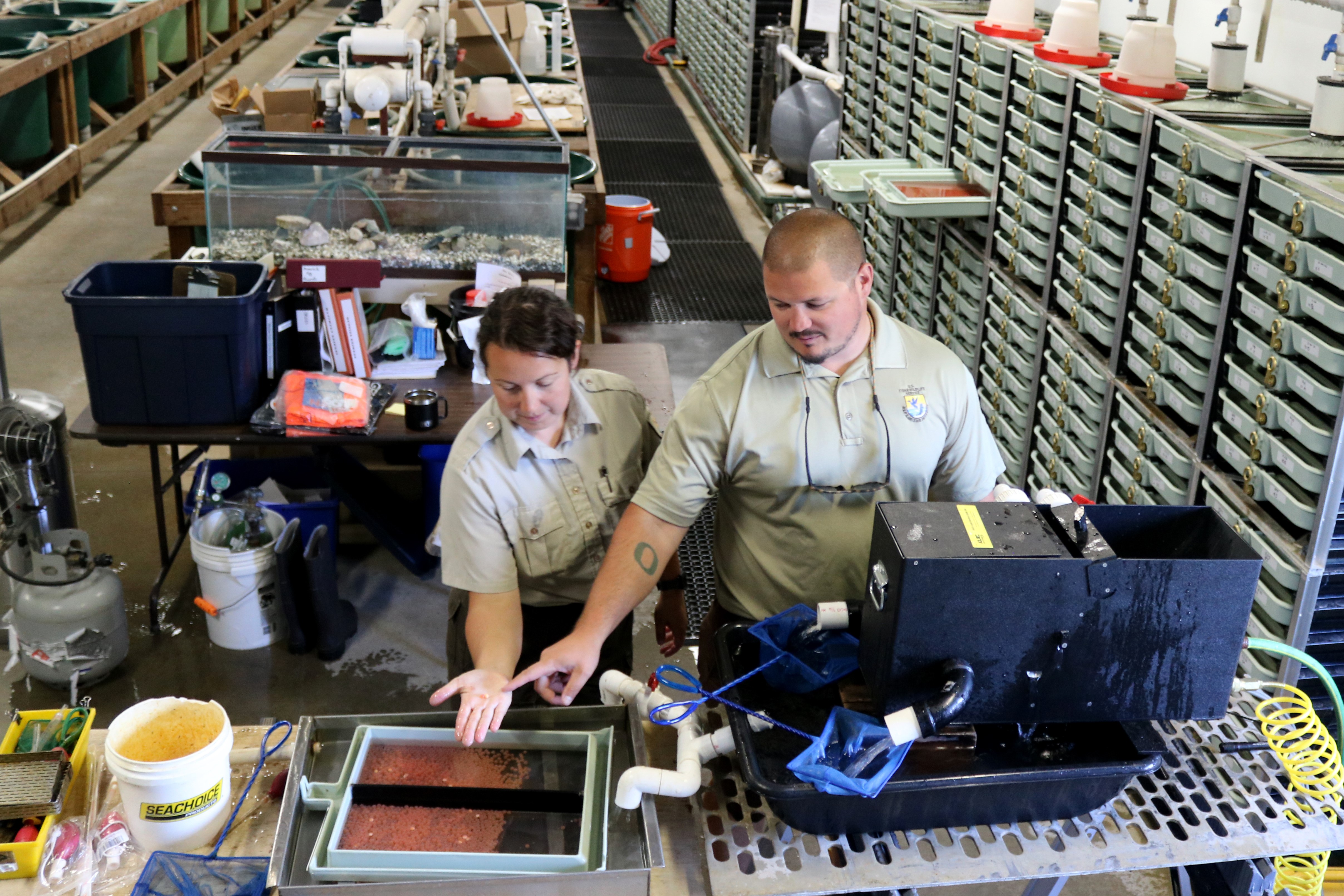 Hatchery Manager Taylor Lipscomb and fisheries biologist Kaitlin Dunham point out the difference between a live egg and a dead one at Livingston Stone National Fish Hatchery on July 11, 2022.