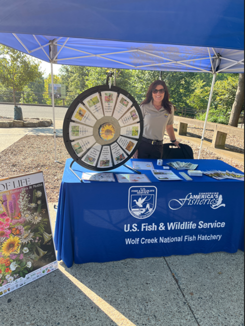USFWS employee Marsha Hart is set up to create a fun, educational tabling activity about pollinators.