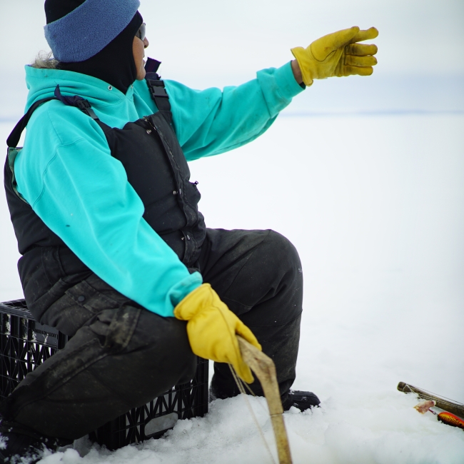 An Inupiaq fisherwoman fishing for sheefish on Alaska's Selawik Lake. Jiggers/niksiks are often made from willow, driftwood, moose ribs or other local materials.