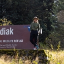 A woman stands near the entrance sign at Kodiak Refuge in Alaska.