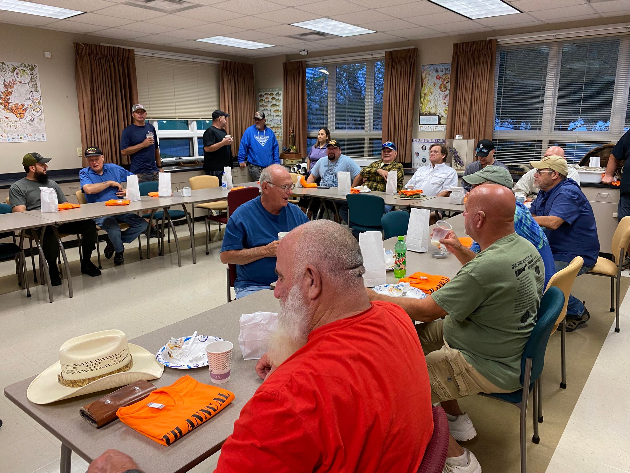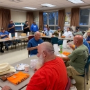 Participants of the 2023 Wounded Warrior Fishing Event enjoying breakfast provided by the Friends of Wolf Creek National Fish Hatchery before boarding the guide boats to fish for stripers on Lake Cumberland.