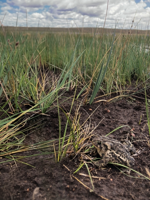A Wyoming toad sits in a muddy clearing surrounded by thick green grasses. The sky is cloudy and blue, and water can be seen in the distance peeking between the grass.