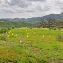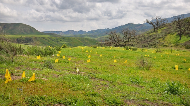 Yellow flags mark locations where San Fernando Valley spineflower seedlings were planted at an introduction site in Los Angeles County. After abundant rainfall, the seedlings are now growing in the thousands across eight sites in the county.