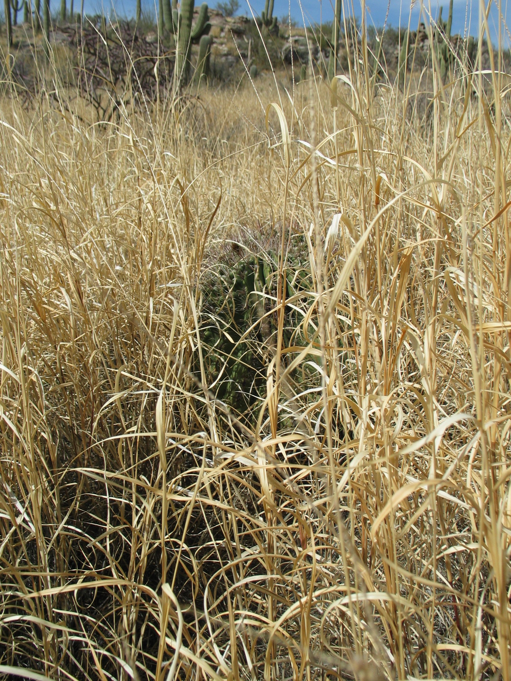 Buffelgrass (Cenchrus ciliaris) crowds out, outcompetes, and ultimately kills native plants. It also prevents young native plants from becoming established, and fuels fire behavior that is devastating to Sonoran Desert plants and animals including Saguaros (Carnegiea gigantea).