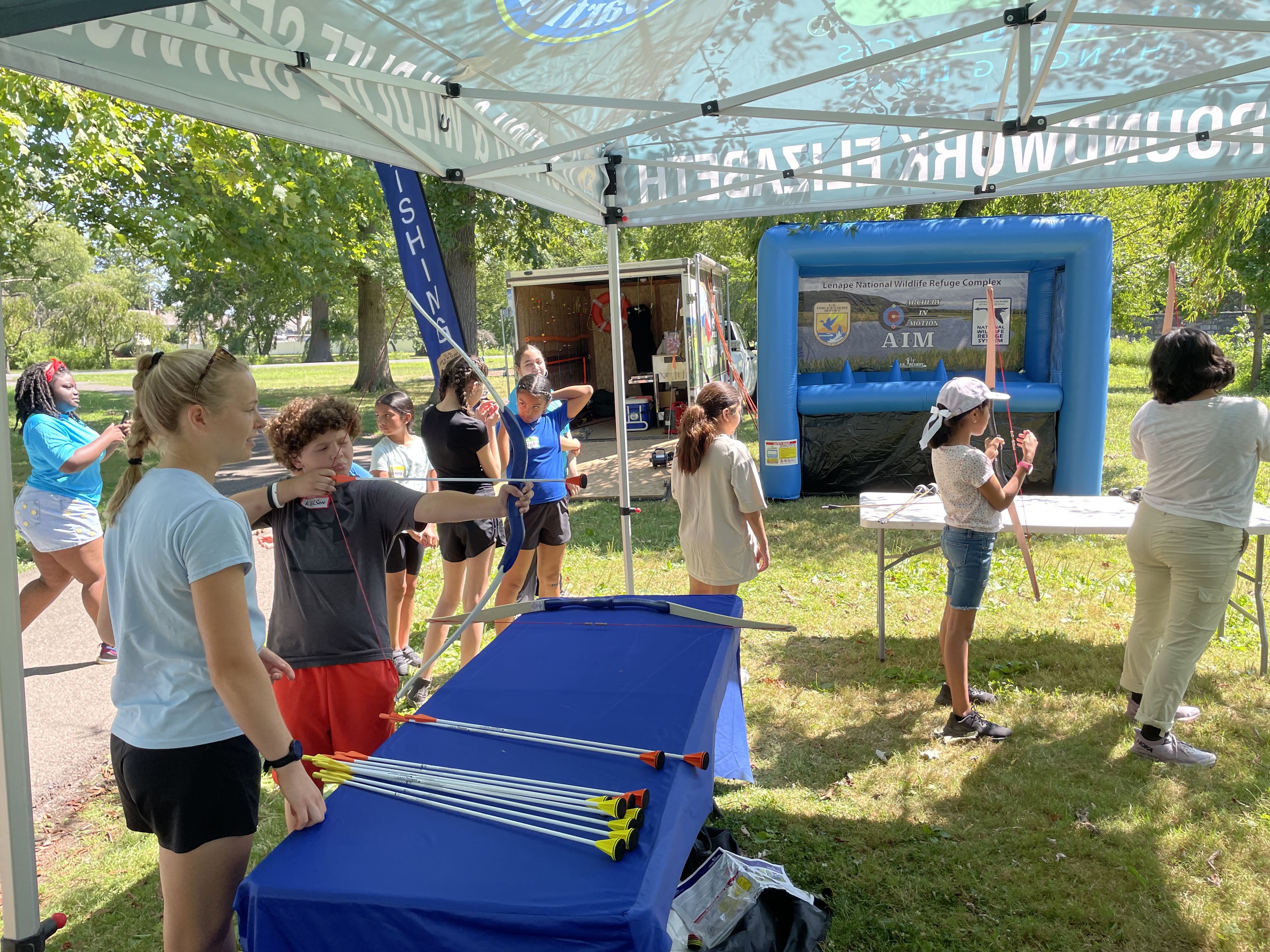Youth participate in archery at the 2024 Cops and Bobbers fishing program as part of the Elizabeth Urban Wildlife Refuge Partnership