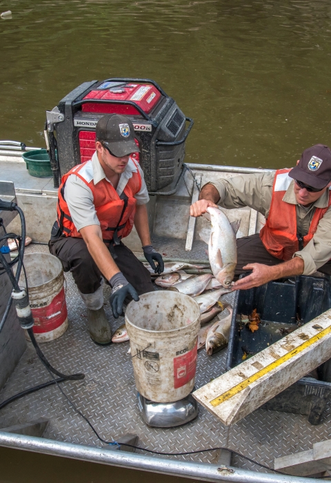 To help inform all invasive carp management, partners use several methods for ongoing monitoring of existing invasive carp populations and to screen for their presence in new areas. Widespread on-the-water sampling helps us detect new movement early on so we can intervene to prevent invasive carp from becoming established. We also use eDNA sampling – or environmental DNA – as an early detection tool and to help guide priorities for where to sample further with more traditional fishing gears like nets and electrofishing. We implant individual invasive carp with coded tags that allow us to track their movement. This technology, as well as hydroacoustics, helps us gather crucial information on invasive carps’ life cycle, population status, congregating habitats and movement.
