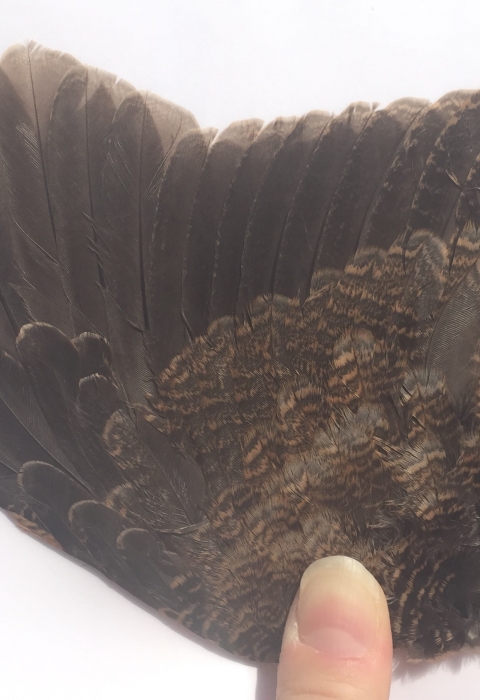 In addition to species, our biologists determine sex and age (adult or young-of-the-year) from the wings. Sometimes, there are obvious differences between sexes or ages. For example, Pintail males and females have different color speculums. For other species, the differences are more subtle, and biologists must look at the colors of one or two feathers. Age can be determined through differences in feather shape, color, pattern, wear, or replacement. Age determination allows the Service to calculate an age ratio (the number of young-of-the-year birds harvested per adult) for each species.