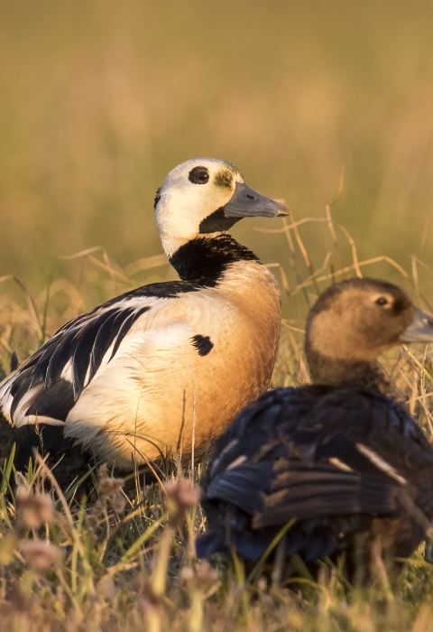 Izembek National Wildlife Refuge has a long history of banding the Steller’s eiders that arrive in the lagoon in the fall to molt (see molt phase below, breeding plumage above). In recent years, Izembek staff have worked with researchers at the Alaska SeaLife Center, the University of Alaska Fairbanks, and other partners to better understand why these birds might be declining in Alaska. To do this, researchers characterize the habitat conditions of Izembek lagoon and the body condition of Steller’s eiders compared to data that were collected prior to the observed declines in eider numbers. Study results will be valuable in understanding lagoon conditions that also impact large numbers of migratory marine birds along the Pacific Flyways, habitat conditions for sea otters and other marine mammals, and environmental change in coastal lagoons rich with biological resources for local communities and fisheries. This project engages strong partnerships among researchers, resource managers, and local communities involved with coastal marine resources in the area.