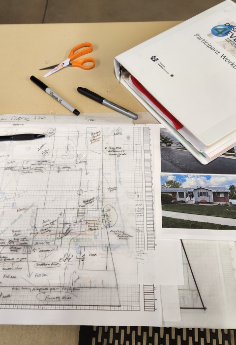 - In-Person Workshop: After completing the online course, participants attended a day-and-a-half-long workshop in which extension staff reviewed participants' concept plans and taught homeowners how to communicate their design ideas graphically. This included sharing sample symbology for landscape features and demonstrating how to ensure uniform scale and directionality when drawing. Participants were given time to develop concept plans and extension staff provided critiques, guidance, and advice to each participant. The staff also taught homeowners how to visualize the movement of water from precipitation and irrigation to design landscapes that allow water to slow, sink, and spread in the landscape. To accomplish this, staff explained the equipment used to store rain, such as cisterns and rain barrels, and where to connect low areas in the landscape and create depressions to capture water. Each of these exercises helped participants think through, create, and draw a feasible landscape design for their personal property. The in-person workshop concluded with tips on how to integrate irrigation technology into designs, create hydrozones, and where to include plants, mulch, and soil amendments.