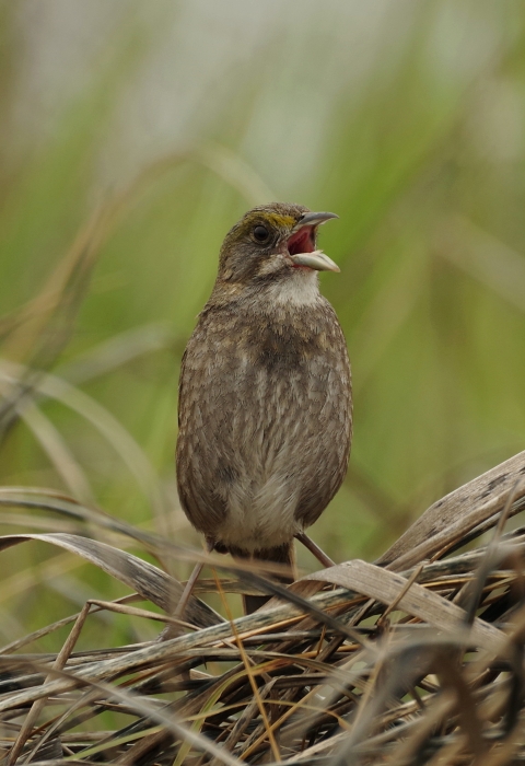 A saltmarsh sparrow (Ammospiza caudacuta) perches above the marsh.
