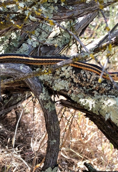 The Alameda whipsnake is a slender, fast moving, snake with a narrow neck, a relatively broad head and large eyes. The snake’s back is a sooty black color with a distinct yellow-orange stripe running down each side. It is an active daytime predator that holds its head high off the ground to peer over grass or rocks looking for potential prey.