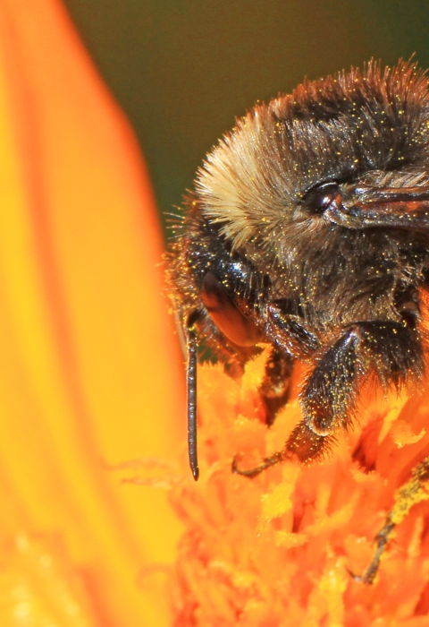 A relatively large bee, the fuzzy black-and-yellow American bumble bee prefers the habitats offered by farmlands and open fields, where they nest below the grass or underground. The loss of this species on the landscape could have devastating impacts on pollination of the many native plants they are known to use, as well as agricultural crops.
