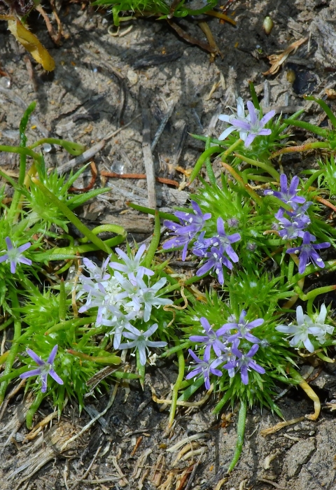 Many-flowered navarretia forms mats 2.0 to 7.9 inches across and 0.4 to 1.2 inches high. The stems have a peeling, white surface and are highly branched. Stem thickness is 0.03 to 0.06 inch and is more or less uniform throughout its length. The leaves are 1.2 to 1.6 inches long and are either entire or have a few thread-like lobes. Flower heads are 0.6 to 0.8 inch across and contain between 10 and 60 pale blue flowers. Each flower in the head is 0.20 to 0.24 inches long. Each fruit may contain as many as three seeds. The fruit of this species is a papery capsule that breaks open only when wet.