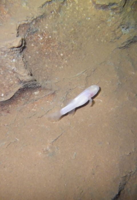The Ozark Cavefish is a small 2-1/4 inch long, blind, pinkish-white fish. Due to the dark environments in which it resides, sight is unnecessary and the cavefish has no eyes.