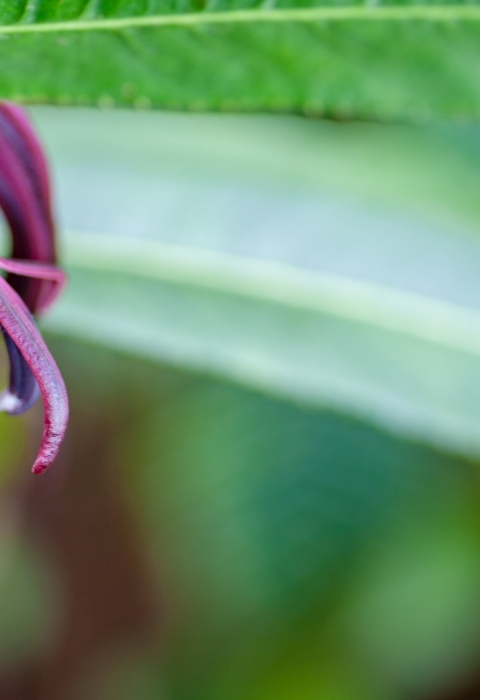 Cyanea koolauensis, a member of the bellflower family (Campanulaceae) and a short-lived perennial, is an unbranched shrub 1 to 1.5 m (3.5 to 5 ft) tall with woody stems and linear to narrowly elliptic leaves with a whitish underside. The leaf edges are hardened with shallow, ascending, rounded teeth. Cyanea koolauensis is distinguished from other species in this endemic Hawaiian genus by the leaf shape and width; the whitish green lower leaf surface; and the lengths of the leaf stalks, calyx lobes, and hypanthium (base of flower) (Lammers 1999).