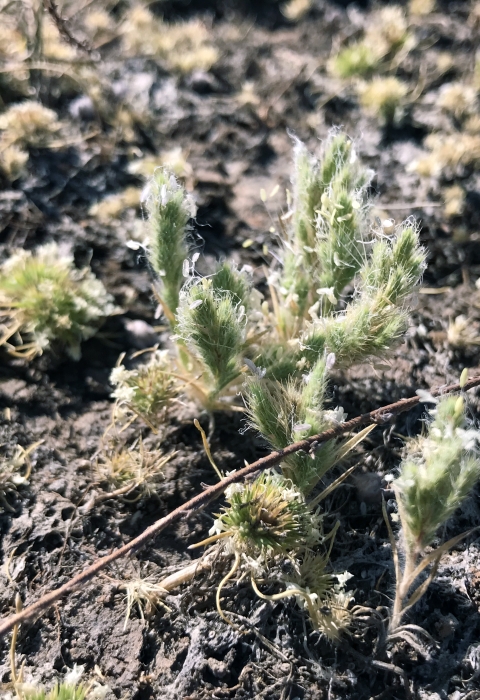 Sacramento Orcutt grass looks different during each of its life stages. Seeds are very small and oval. Plants in the aquatic phase are small and inconspicuous and have stems that lie flat or are supported by the water during this time. Leaves that form during the aquatic life stage are cylindrical and clustered into a small rosette. As vernal pools dry, Sacramento Orcutt grass plants becomes terrestrial. In its terrestrial stage, Sacramento Orcutt grass is a small plant that grows 1 to 4 inches tall. Unlike most grasses, Sacramento Orcutt stems are filled pith, which is a soft and spongy center found in many flowering plants. Each plant may have multiple slender upright stems crowned with a spike of densely grouped tufts. Sacramento Orcutt grass has tiny white flowers that have five petals with the middle petal being longer than lateral petals. The cylindrical leaves of the aquatic life stage transform into flattened blades and are distributed along the stem during the terrestrial life stage. The stems and leaves are covered with small hairs that secrete a sticky substance. The stickiness increases as the plant matures and likely helps repel herbivores. Like other Orcutt grasses, the leaves lack a ligule, or a small outgrowth found at the junction of leaf and leafstalk on some grasses.