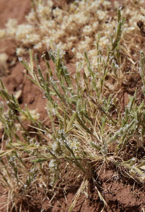 Slender Orcutt grass looks different during each of its life stages. Plants in the aquatic phase are small and the stems lie flat or are supported by the water. Leaves that form during the aquatic life stage are cylindrical and clustered into a small rosette. As vernal pools dry, slender Orcutt grass plants become terrestrial. In its terrestrial stage, slender Orcutt grass grows 2 to 8 inches tall. Unlike most grasses, slender Orcutt stems are filled pith, which is a soft and spongy center found in many flowering plants. Each plant usually has one to a few stems that begin branching about halfway with the spikelets that support the florets. The cylindrical leaves of the aquatic life stage transform into flattened blades and are distributed along the stem during the terrestrial life stage. The stems and leaves are covered with small “hairs” that secrete a sticky substance. The stickiness increases as the plant matures and likely helps repel herbivores. Like other Orcutt grasses, the leaves lack a ligule (a small, outgrowth found at the junction of leaf and leafstalk on some grasses).