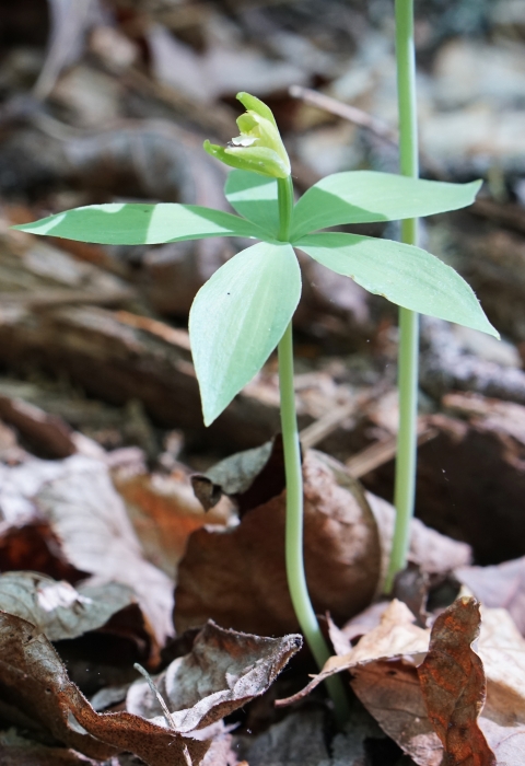 The small whorled pogonia has a single stem and oblong leaves that are grayish-green in color. A single or paired green-yellow flower can be visible in May or June.