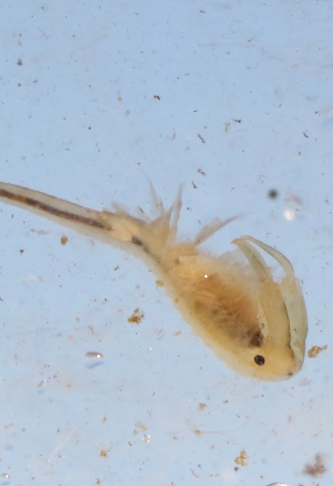 Female vernal pool fairy shrimp carry fertilized eggs in a sac on the underside of their body. The eggs are either dropped to the pool bottom or remain in the brood sac until the mother dies and sinks to the bottom of the pool.