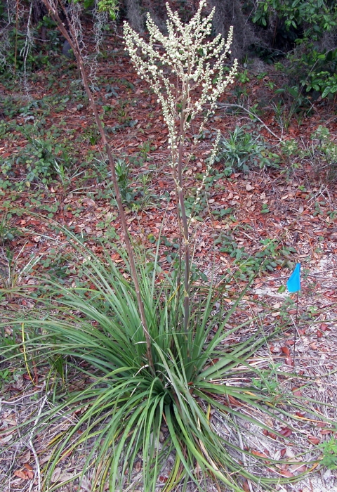This perennial herb characterized by long, grass-like leaves emerging from a central clump on a bulbous stem. The plant's young leaves, about half an inch wide, grow erect, while older leaves spread out six feet long. The plant produces a 3 to 6-foot stock topped with a striking cluster of small white flowers that bloom from March to May.