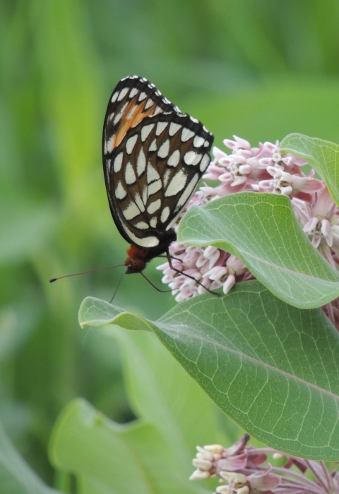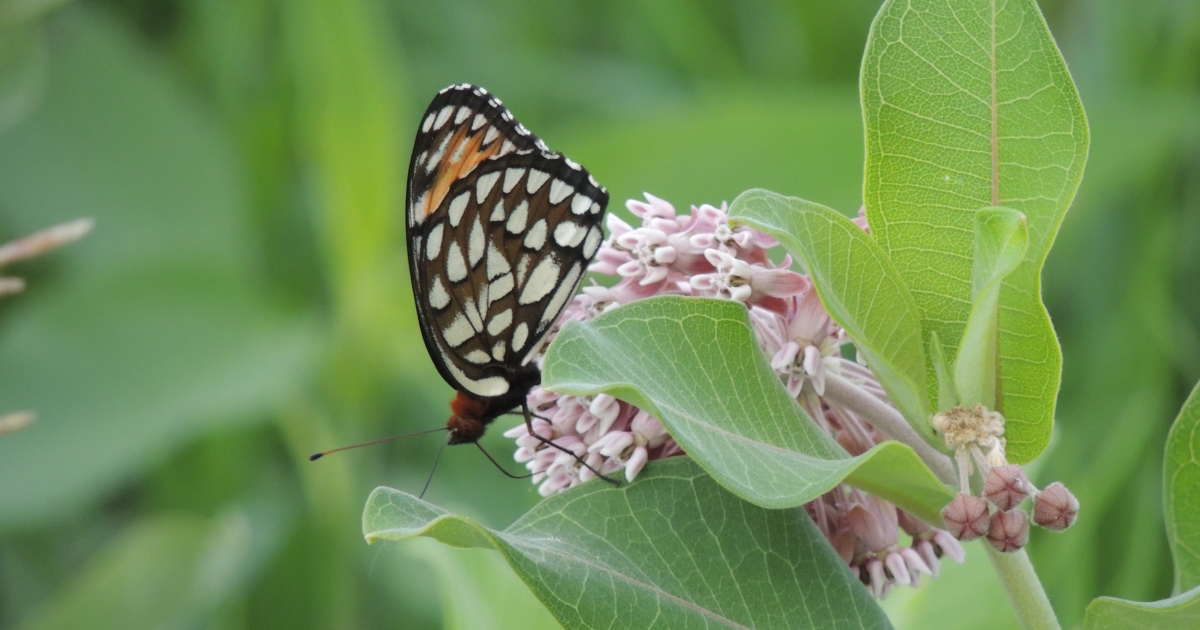 The regal fritillary is a brush-footed butterfly with large, orange and black wings. It is known for its bold coloring and a symbol for prairie restoration. Its name comes from a Latin word meaning "dice box," probably for the checkered pattern on its wings. This pollinator is found in remnant tall-grass prairies from the Great Plains eastward where they sip nectar from milkweed and more.