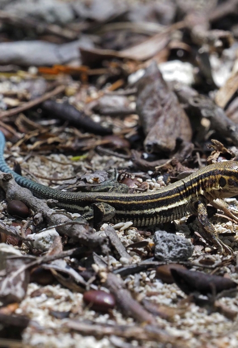 The St. Croix Ground Lizard is a small species of Ameiva measuring 35 to 77 millimeters in snout-vent length. It has parallel longitudinal black, white, and light-brown stripes. The belly is light gray with lateral blue margins, and pinkish undersides of legs, throat, and chest. The tail also has alternating rings of blue and black. Nothing is known of this species' reproductive biology.