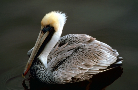 Adult brown pelicans are a large dark gray-brown water bird which is white around the head and neck. They have large bills suitable for scooping fish out of the water. They can reach up to eight pounds with wing spans more than seven feet long. Young pelicans are gray-brown above and on the neck, with white underparts.