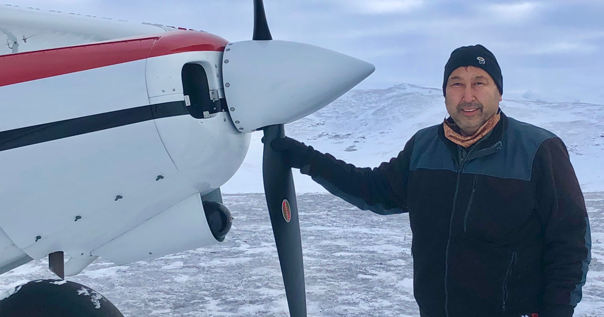 Federal Wildlife Officer/ Airplane Pilot Robert Sundown taking in the view from his single engine tandem seat aircraft over a snow blanketed landscape. Courtesy of Nili Sundown.
